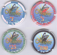 Millionaires Casino Cruises set of 6 rack chips.  Unique set from the ship that was shut down the day before its inaugural cruise due to irregularities and subsequently sailed out of TX under a different name.